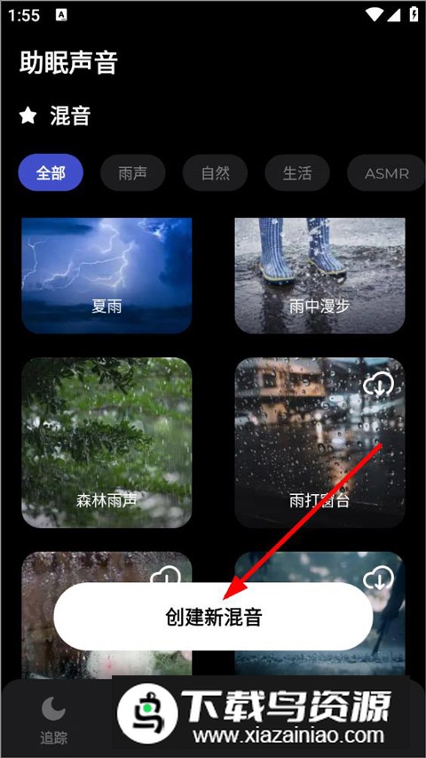 2、在发现页中浏览各类助眠声音,例如雨声、自然音效等,点击创建新混音选项;