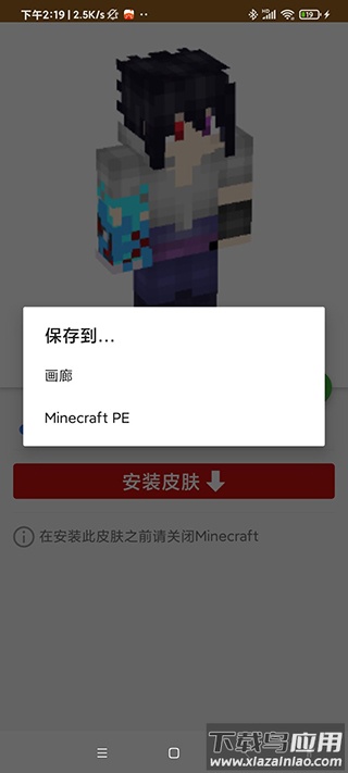 点击安装皮肤按钮,在弹出选项中选择保存到“Minecraft PE”目录。