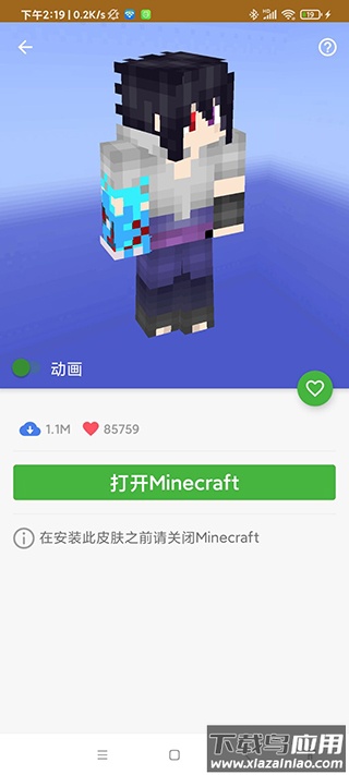 页面会展示该皮肤的动画效果,并显示下载次数与收藏数量,请注意提示:在安装此皮肤前需要先关闭Minecraft游戏。