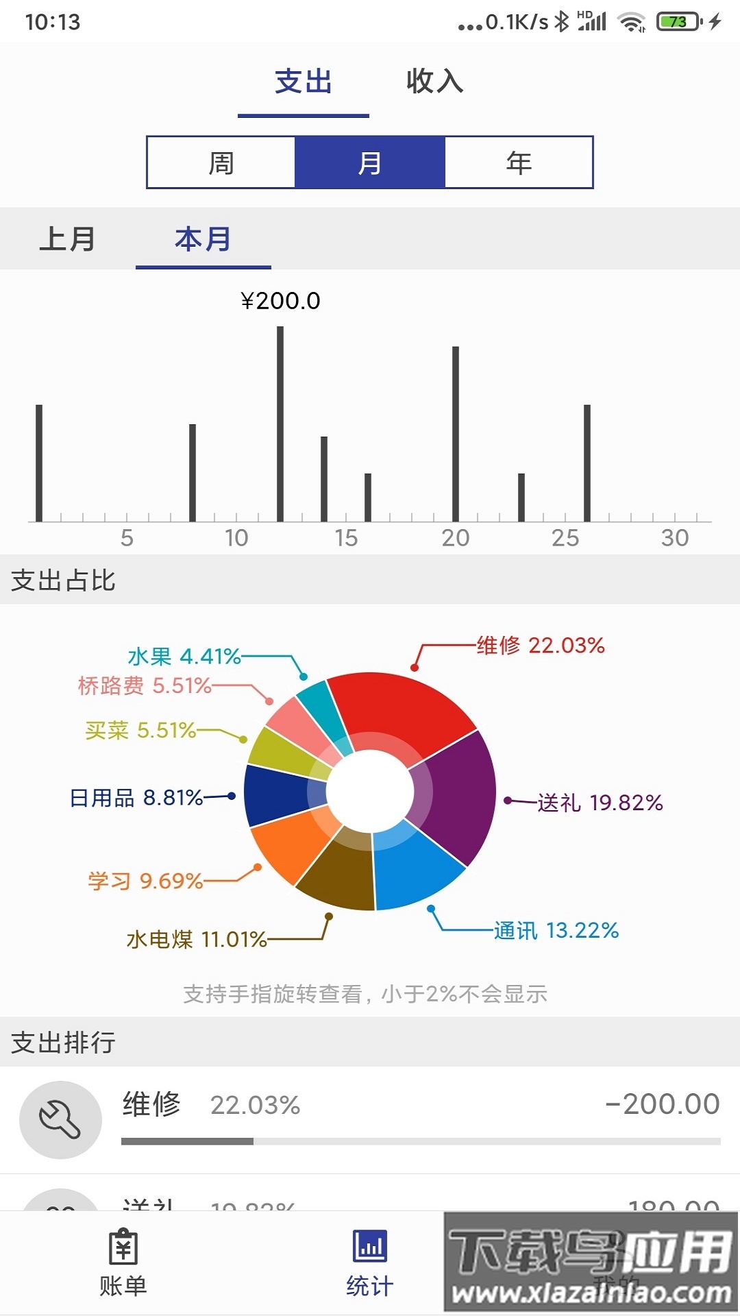 每月支出一目了然,自动汇总详细数据,生成消费统计。