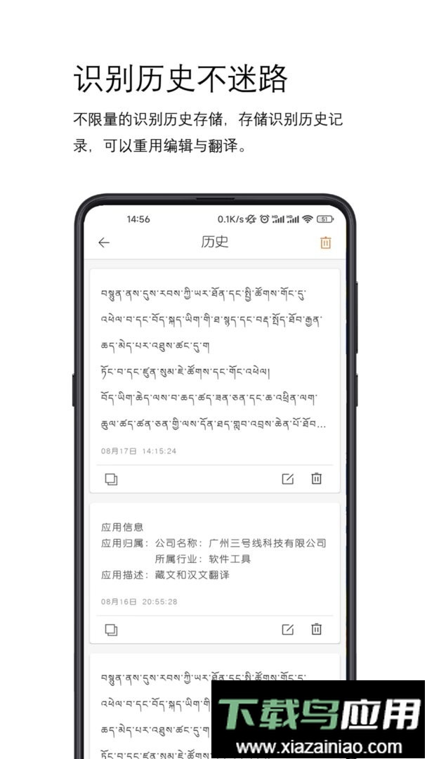 识别藏文或汉文成功后,结果将自动保存至当前账号的历史记录中,无需手动操作;用户可在历史列表页面查看最近的识别内容。