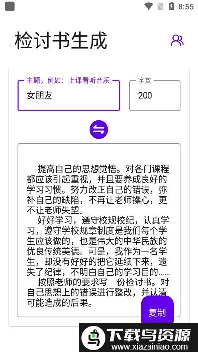 写锤子检讨书app最新版支持自由选择与预览,随后便能自动生成检讨书;用户还可以自由设定文本的字数要求,整体操作简单便捷。