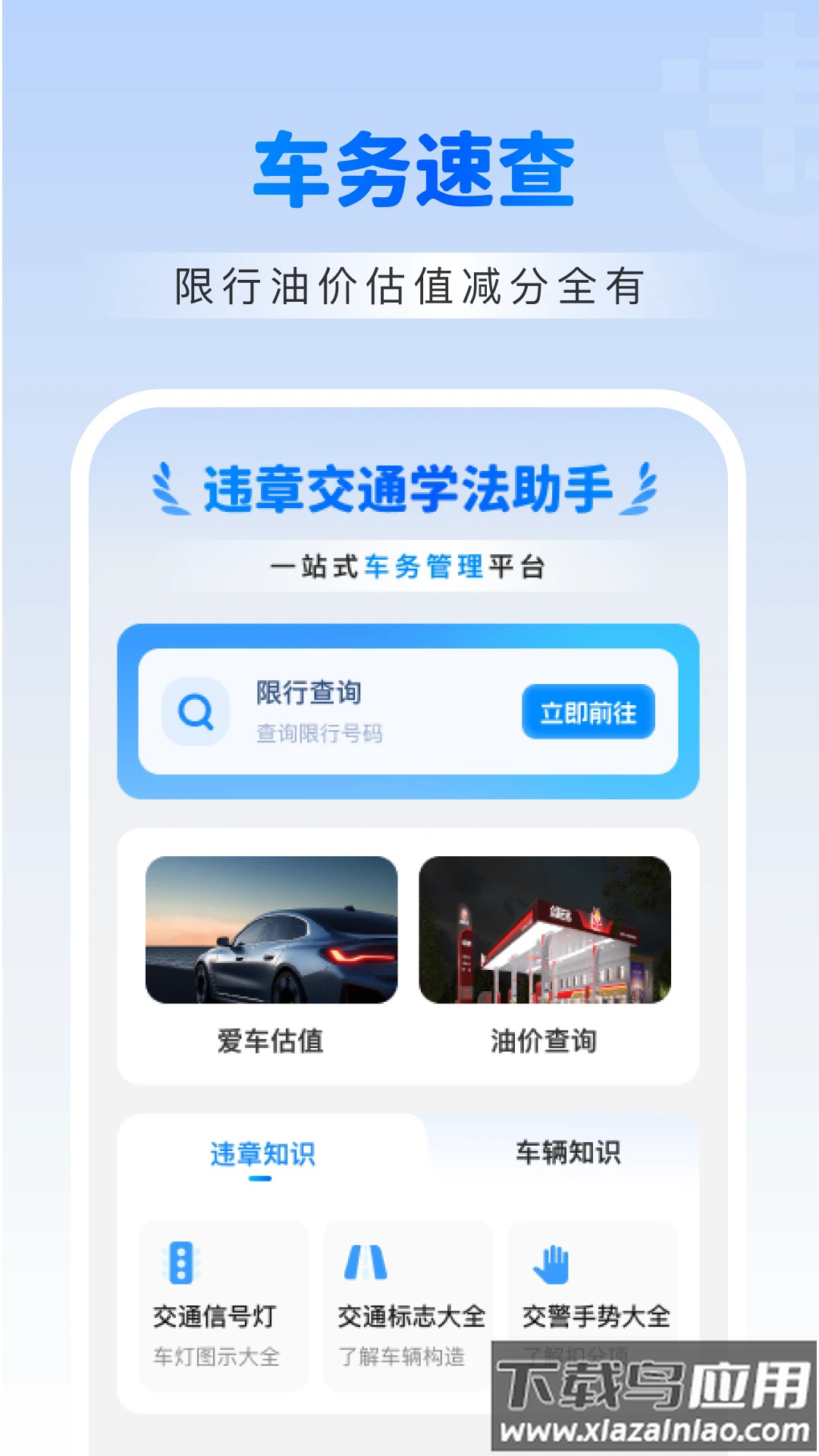违章交通学法助手由南宁优量网络科技有限公司开发,是一款面向车主的综合车务应用。它整合了油价查询、车辆估价、交通规则学习以及学法减分练习等多项实用服务,旨在帮助用户更方便地处理日常车务,并为相关考试提供备考支持。
