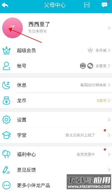 2、进入父母中心页面后,点击顶部的个人账号头像。