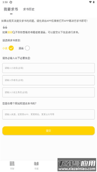 3、如果未找到想读的小说,可以通过求书功能提交作品信息。