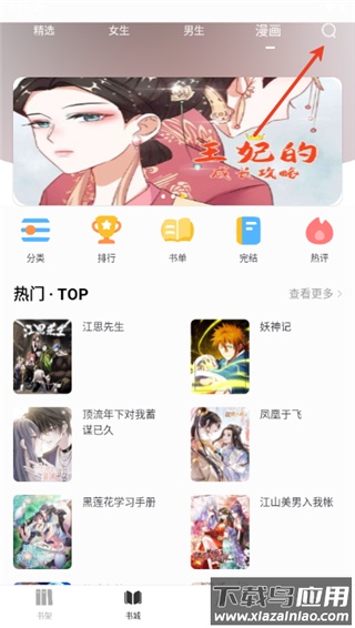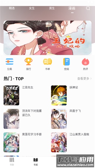 2、书城界面会展示热门推荐作品,同时设有排行、书单、完结、热评等分类板块。