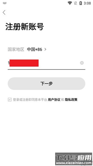 4、注册需填写手机号码,勾选用户协议与隐私政策后进入下一步;