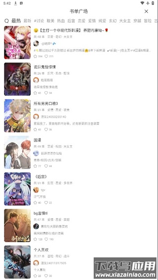 3、点击主页上方的书单图标,可以看到其他用户创建的热门书单;每个书单收录同一类型的多部漫画,输入想看的风格关键词,就能发现更多宝藏作品。