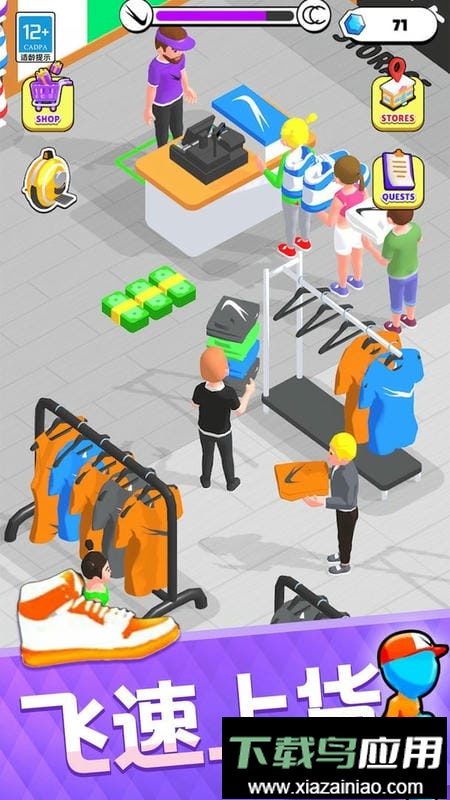 游戏中你需要逐步搭建店铺的各个功能区域;首先设立货架,才能从仓库中将潮流商品陈列出来,出售给进店的顾客。在忙碌的营业过程中,你可以雇佣员工协助上货与收银工作,还能为他们升级属性,提高移动速度与货物携带量;当然,你也可以提升自身的行走速度与搬运能力。关卡内还提供了实用道具,例如加速载具能让你在场景中快速移动,清洁人员则能打扫店铺环境,让顾客更顺畅地试穿商品。