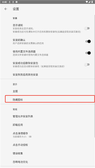 2、在设置菜单中找到隐藏图标选项;