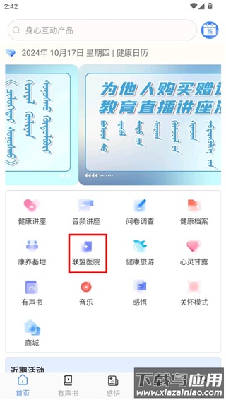 1、打开软件后,在功能栏中找到联盟医院选项并点击进入;