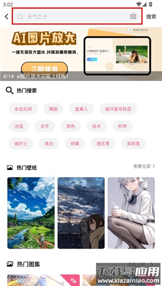 2. 在搜索页面中,会显示热门搜索词、流行壁纸及图集推荐;在输入框键入关键词后,系统将实时展示关联结果;