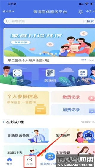 打开青海医保app,在首页进入“服务”菜单。