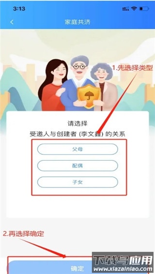 支持添加父母、子女、配偶三类成员,以父母为例,选择“父母”后确认。