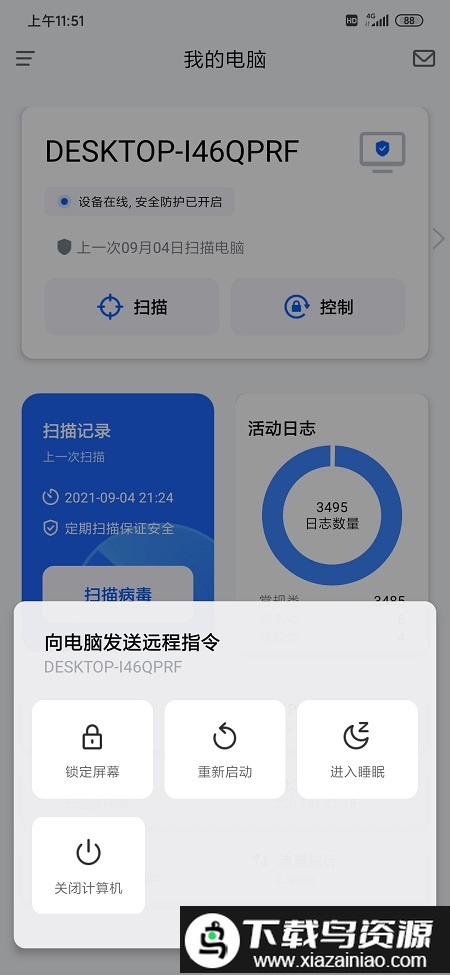 用户可在手机端操作奇安信安全防护的电脑端功能,包括启动病毒扫描与查看扫描报告。借助该软件,能够远程管理自己的设备,例如锁定屏幕、重启系统、进入睡眠或直接关闭计算机,从而随时随地掌控设备状态,兼顾便捷性与安全性。