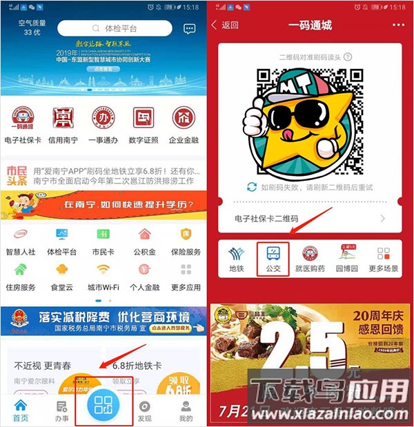 1、下载并登录爱南宁app官方版,点击首页二维码标识,根据提示开通公交乘车授权;
