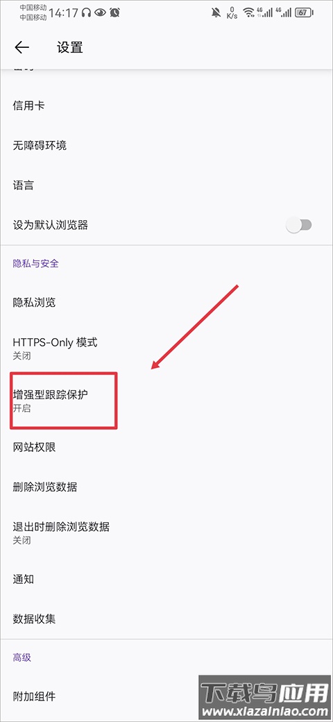 3、进入设置界面后,找到“隐私与安全”栏目,点击进入“增强型跟踪保护”