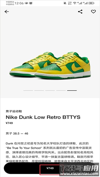 2. 进入商品页面可查看鞋款简介,包括图片展示、尺码选项、价格说明及详细产品介绍。