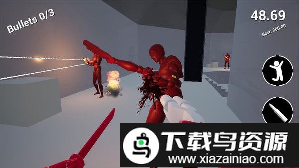游戏整体呈现极简主义艺术风格,敌人以红色标示,武器为黑色,与白灰为主的环境背景形成鲜明对比。