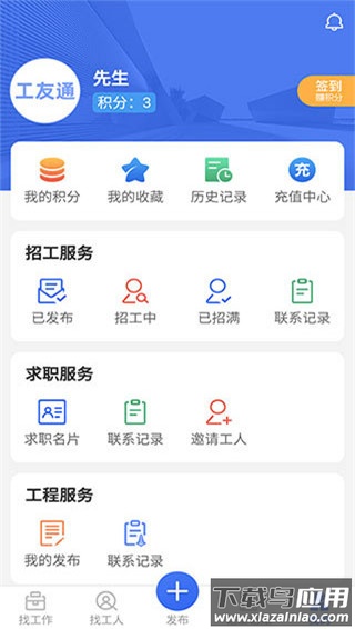 5. 我的板块可管理账号信息,查看历史记录与招工服务等内容。
