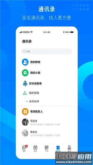 2、企业通讯录:快速查找同事信息并发起对话,提升联络效率;
