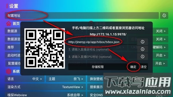 3、在配置地址栏中填入网址:http://cdn.qiaoji8.com/tvbox.,完成后确认保存;