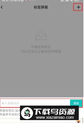 点击右上角加号,输入想要屏蔽的标签名称,确认添加即可完成设置。