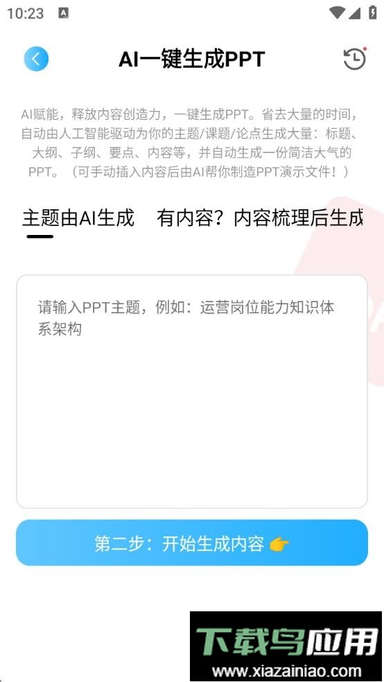 ai ppt免费版是一款能够协助用户快速创建演示文稿的手机应用。只需输入相关文案与核心内容,这款工具便可在短时间内生成视觉效果出色的幻灯片文件,适合有需要的人群下载使用。