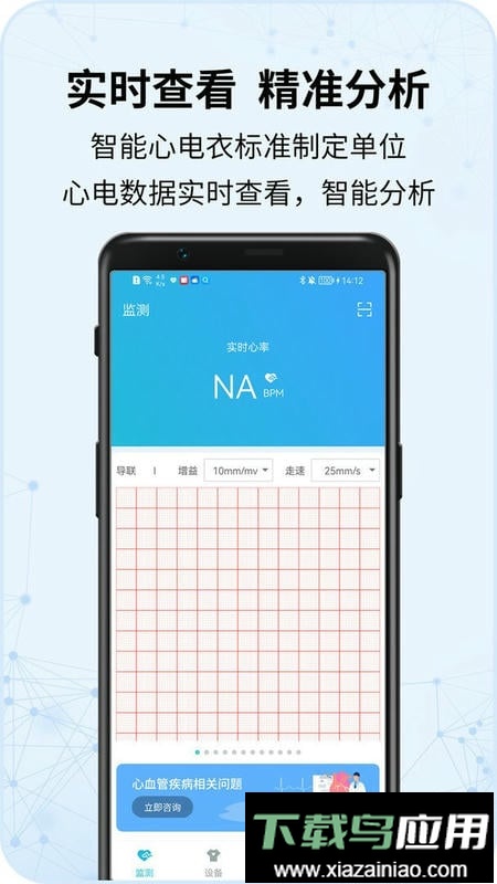 该应用搭配善行医疗12导联智能心电衣使用,可实现医疗级远程心电记录、监测与诊断。用户完成简易注册并与设备绑定后,即可实时查看并持续记录个人心电图数据。