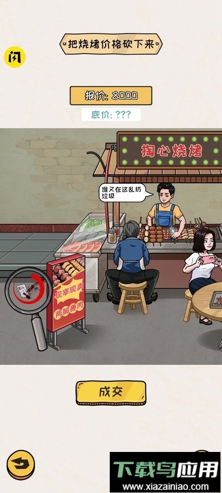 谁是大聪明是一款充满趣味的休闲解谜闯关游戏,玩家将扮演一位精明的顾客,目标是在一家烧烤店里用最少的钱买到烧猪。游戏需要你仔细观察场景中的各种细节,并通过点击互动来发现隐藏的线索和破解谜题。