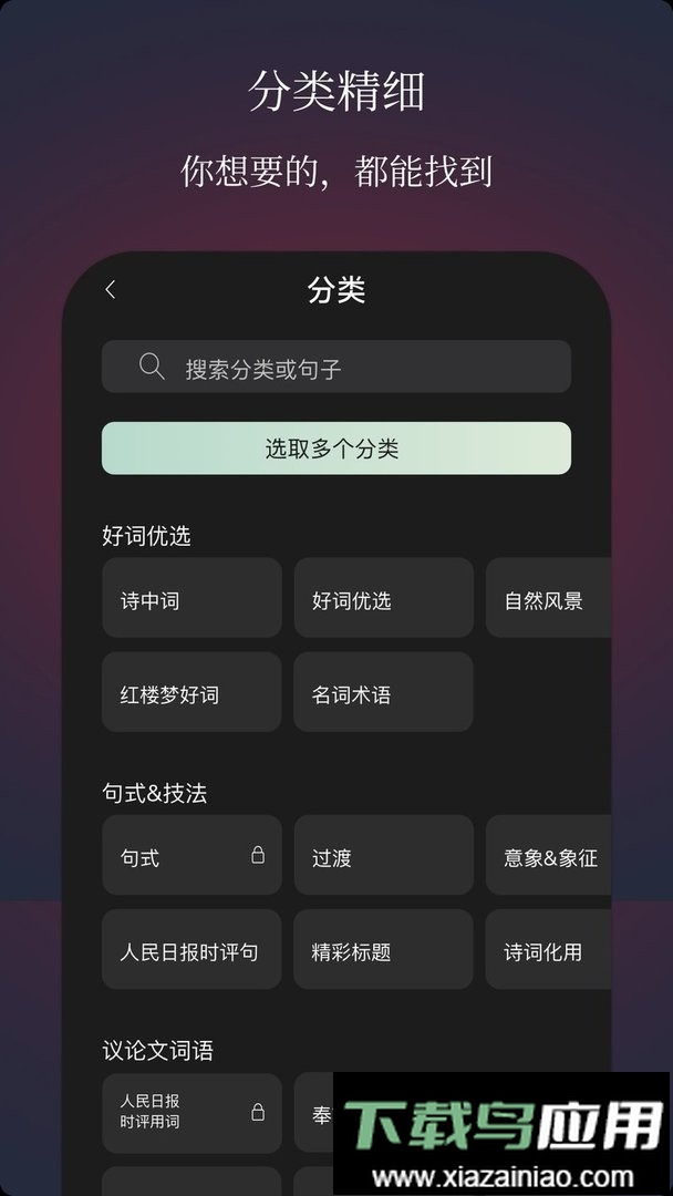 3. 资源分类细致:软件包含大量名人名言、时事素材、人物事例、高考中考范文、写作模板与技巧等多种资源;分类标签非常详尽,并且会不断新增更多类别。