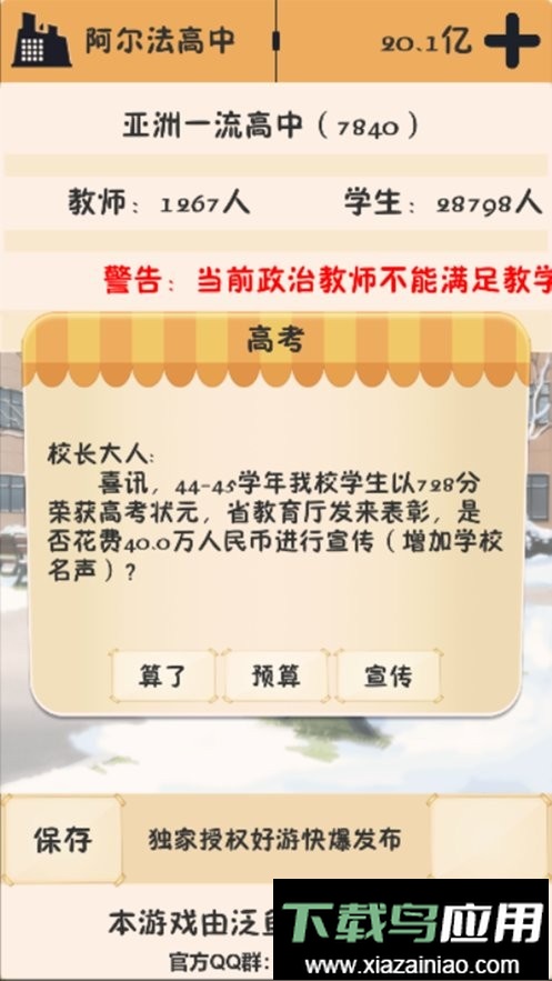 3、玩法与常见模拟游戏相似,玩家身为校长需要招收优质学生,促进他们在德智体美等维度全面发展,最终目标是在高考中带领学生取得出色成绩;
