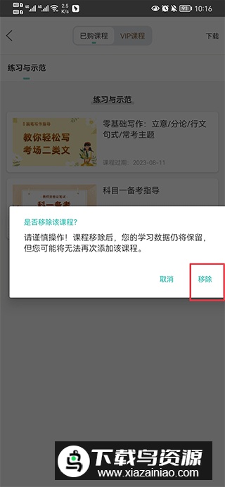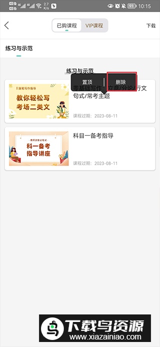 2.在需要删除的课程上长按,界面会显示置顶或删除选项,点击删除按钮。
