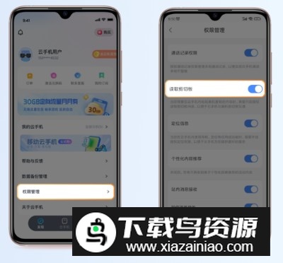 在【我的】页中打开【权限管理】,启用【读取剪切板】右侧的开关;此后你可以将本地手机复制的文本,直接粘贴到云手机内的输入框中。