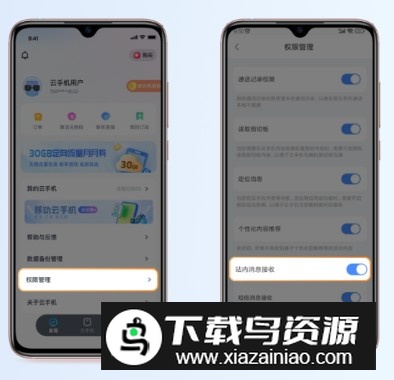 打开【我的】页面,进入【权限管理】设置,将【站内信息接收】功能右侧的开关启用,即可实时接收云手机内应用发送的通知和信息。
