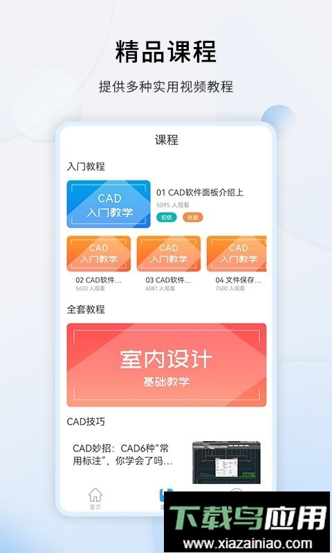 应用旨在帮助用户轻松掌握CAD作图方法与流程,同时传授众多高效技巧及快捷键配置方案,助力使用者显著提升绘图能力,让设计工作更加流畅快捷,成为建筑及工程设计领域从业者的得力学习工具。