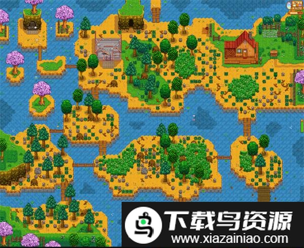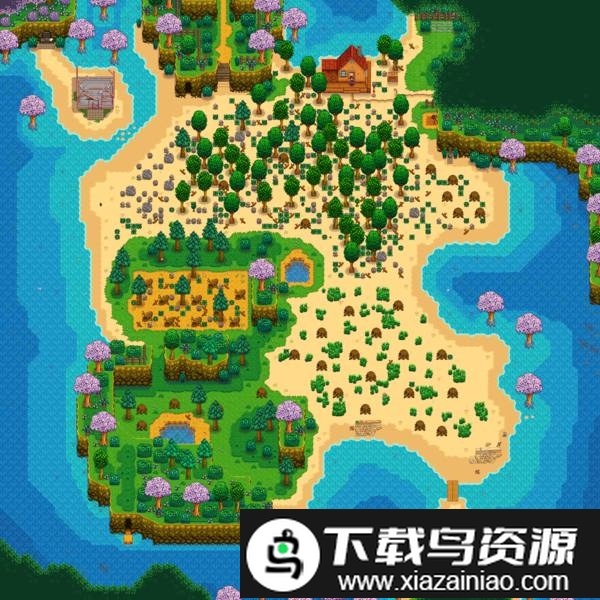 左下区域包含一片水域可供垂钓,但垃圾率偏高;右下区域模仿山顶农场,设有一块能刷新石头与矿石的采石场。