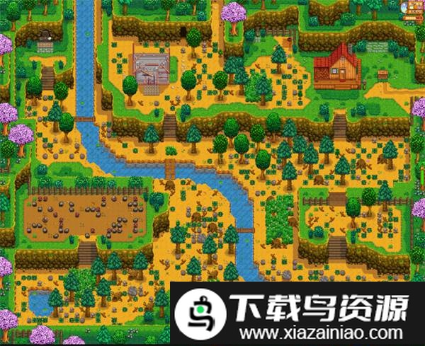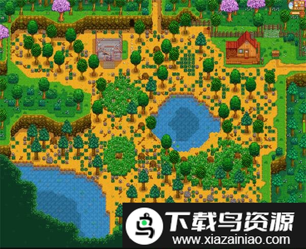 农场内的池塘可以钓到小嘴鲈鱼,也有较低几率钓到秘密森林特有的木跃鱼,但钓上垃圾的概率接近一半;树林与河流的布局使得可耕地有所减少。