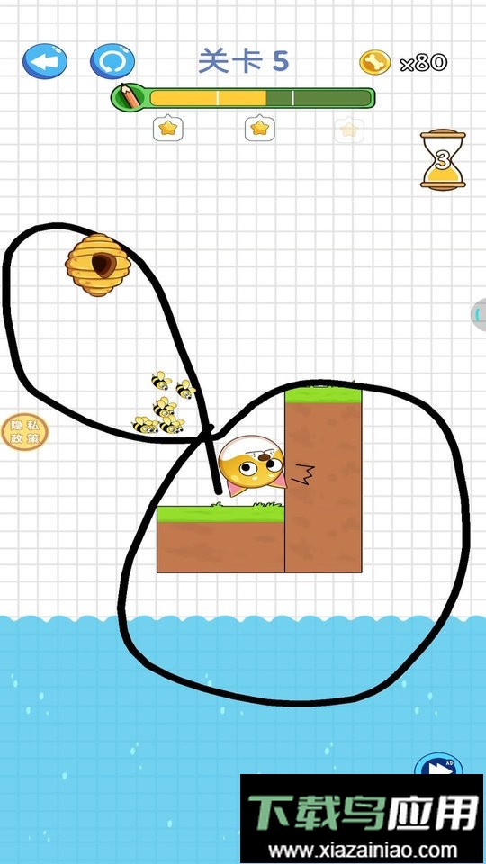 游戏界面设计十分简洁,整个挑战世界都由玩家手中的画笔来创造;它非常适合用于休闲放松,但画线时务必严密,否则蜜蜂会找到空隙突破防线;每个关卡都可以自由尝试,玩家需要开动脑筋,让小狗安全抵达终点。