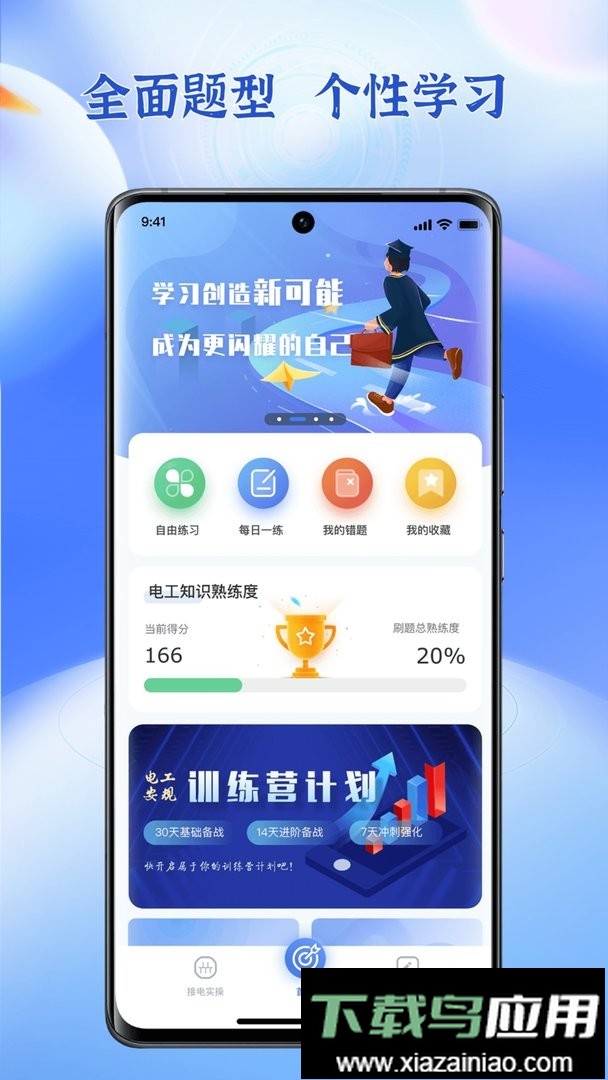 本应用由技能家团队研发,专为参加低压电工考核的学员提供移动学习服务。它面向全国电工技术人员,针对上岗证、操作证及等级证等多种考试需求,提供了实时更新的理论题库与虚拟实操考核模块。应用内设有接电实操、专项训练、自由练习、每日一练、错题回顾与题目收藏等多种学习模式,旨在帮助学员扎实掌握电工知识与操作技能,顺利通过考试并快速取得相应资格证书。