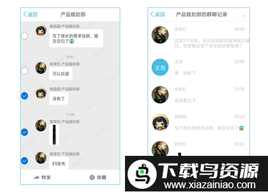 在聊天界面长按消息可进行多选,将多条记录合并后一并转发给同事,使信息分享更加集中高效。