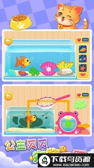 4. 游戏中包含多种宠物角色,例如小鸟、金鱼、小海龟、小猫等可爱动物;