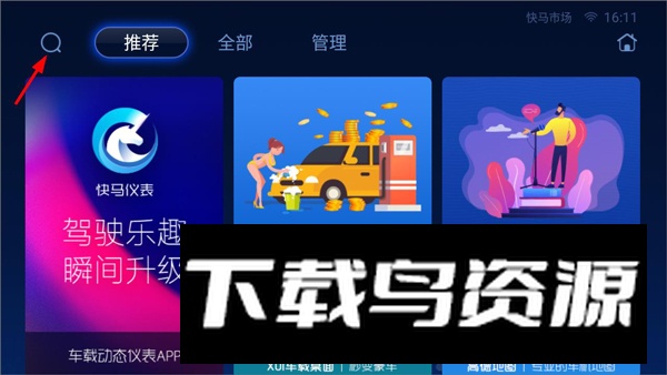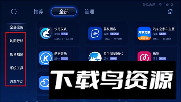 1、在车机上打开快马市场应用,进入主页浏览推荐或全部应用。