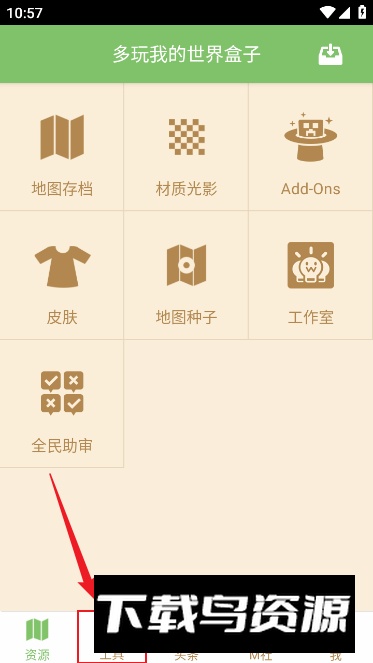 1.打开多玩我的世界盒子应用,进入首页后,点击底部导航栏中的工具选项。