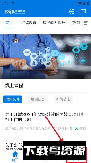 1. 在本站下载浙卫培训学习应用,安装后打开首页。