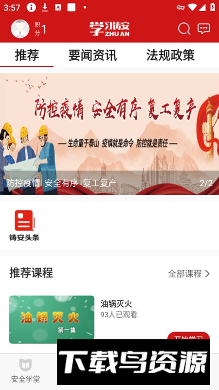 平台功能丰富多样,包含学安头条、推荐课程、安全微课程及各类安全资讯;