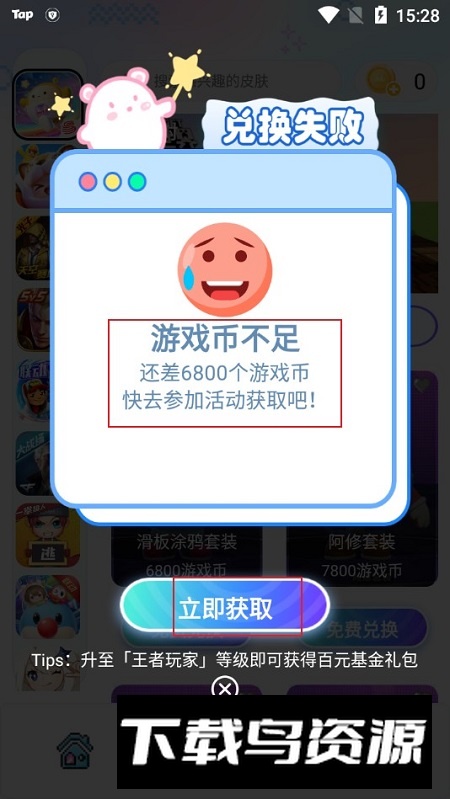 5.若系统提示游戏币不足导致兑换失败,可点击页面上的立即获取按钮,通过观看广告免费赚取游戏币后重新尝试兑换。