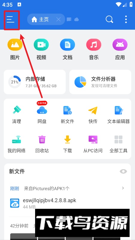 1、打开ES文件浏览器应用,点击界面左上角的菜单图标;