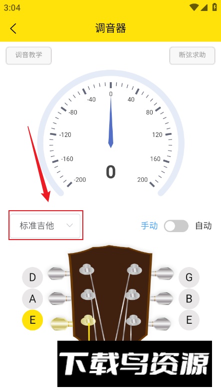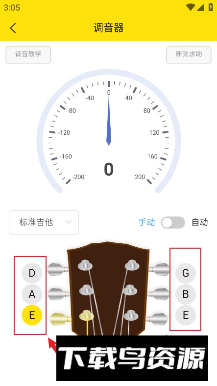 3、在调音器页面,按需选择【标准吉他】等模式,并设定手动或自动操作。