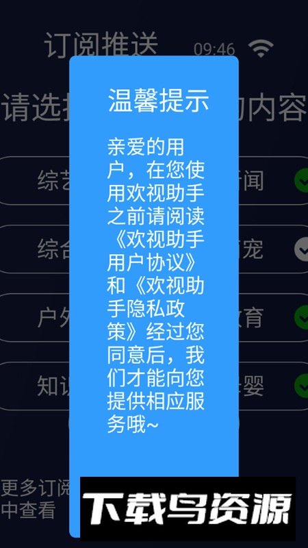 4. 安装完成后打开欢视助手,选择你希望观看的电视台直播分类,即可免费收看节目。